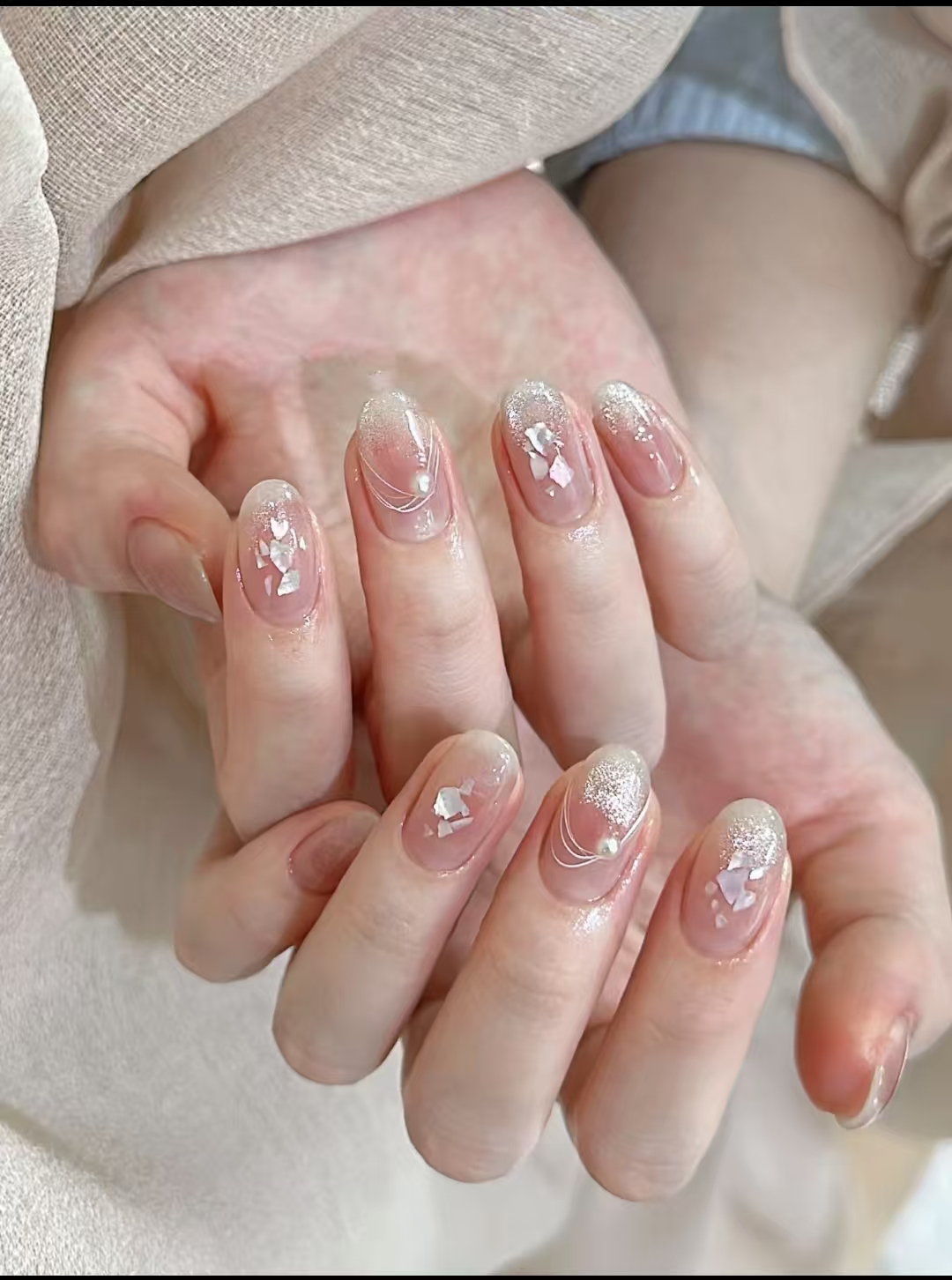 贝壳美甲的魅力,首先在于它对自然元素的巧妙运用。无论是完整的小贝壳切片,还是细碎的贝壳粉,都能成为美甲师手中的“魔法材料”。将打磨光滑的贝壳片小心翼翼地贴在甲面,再覆上一层通透的底胶,贝壳独有的虹彩便会在光线流转中变幻出珍珠白、淡粉、浅蓝等渐变色,仿佛把一片微缩的海面锁在了指尖。而细碎的贝壳粉则更显灵动,混合在透明甲油中,涂抹后如月光洒在海面,泛起朦胧的光泽,低调却不失精致。
