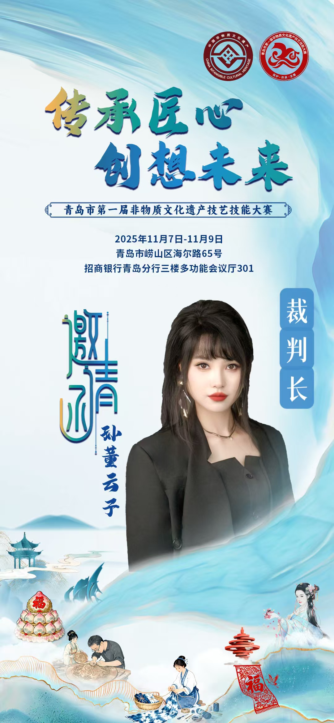 孙董云子老师凭借其在美妆领域的深厚造诣与卓越成就,受邀担任由青岛市中华职业教育社、青岛市总工会、青岛市人力资源和社会保障局以及青岛市文化和旅游局共同举办的“青岛市第一届非物质文化遗产技艺技能大赛”妆造大赛的裁判长。