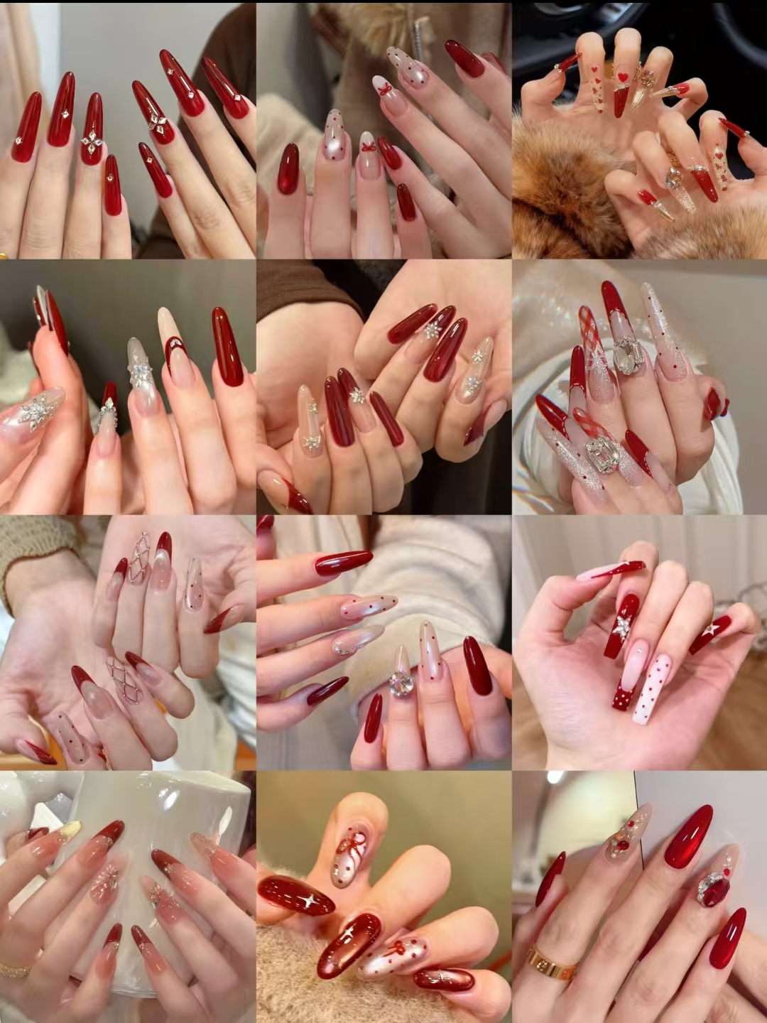 新年美甲的配色,向来绕不开浓郁的年味色系,经典又永不过时。正红色是当之无愧的主角,热烈明艳,像冬日里的暖阳,像新春的鞭炮红,涂在指尖,自带气场与喜庆,不管是纯色满涂,还是搭配简约的金线、碎钻,都能轻松拿捏新年的氛围感。酒红色则多了几分优雅与复古,低调中透着精致,适合偏爱温柔气质的女生,搭配磨砂质感,更显高级。除了红色系,金色、银色作为点缀色必不可少,金芒璀璨、银辉清冷,与红色相融,瞬间提升美甲的精致度,仿佛把星光与福气都凝在了指尖。而近年流行的豆沙红、奶咖红,中和了正红的张扬,多了几分温柔软糯,适配日常穿搭,新年走亲访友、聚会出游都不违和。